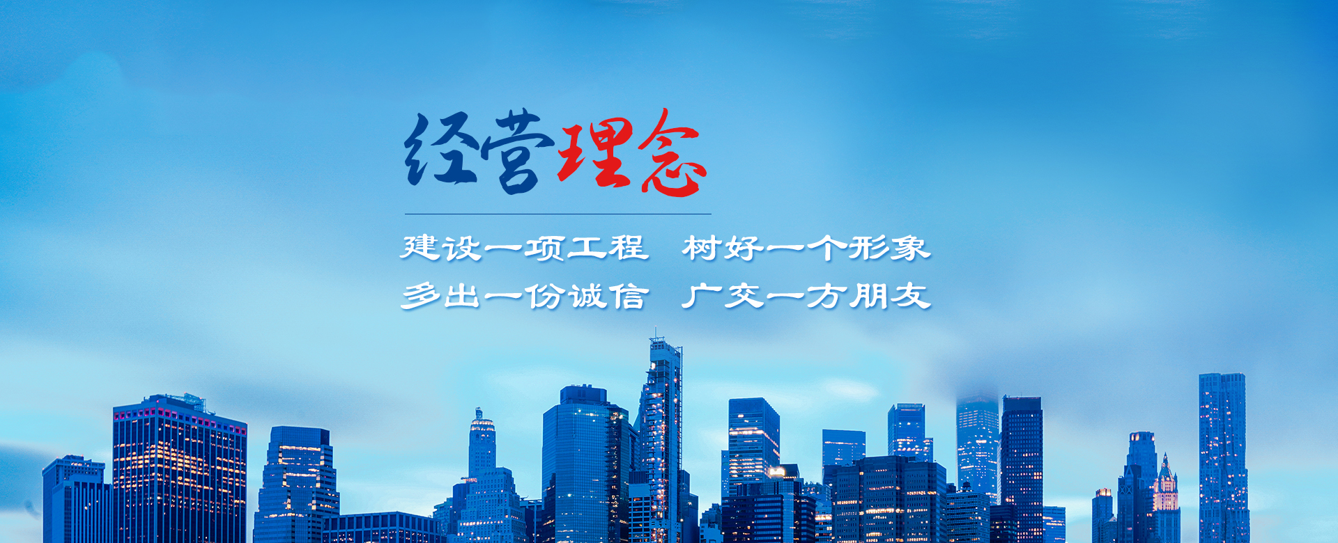 公司以建造合格建筑產(chǎn)品、助力國家建設為使命,以構(gòu)建幸福企業(yè)為愿景。公司深知助力國家建設為使命所擔負的責任,故以“如履薄冰、如臨深淵、高調(diào)精細做事、低調(diào)謙虛做人”為工作理念,建立了完善的管理制度和質(zhì)量保障體系,以人為本,構(gòu)建和諧環(huán)境。公司牢固樹立安全意識、文明意識、質(zhì)量意識、環(huán)境意識和精品意識。在公司質(zhì)量管理過程中貫徹“雙百”方針:即工程合格率100%,客戶滿意率100%。以“建設一項工程,樹好一個形象,多出一份誠信,廣交一方朋友”為公司經(jīng)營理念。